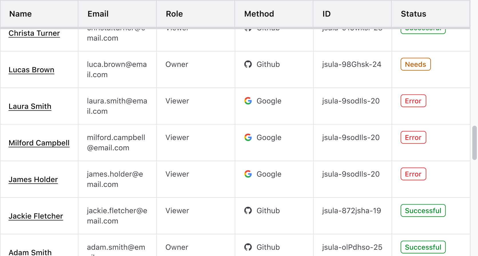 Column with badges that have different length labels end aligned. The badge labels are "Successful", "Needs confirmation", and "Error".
