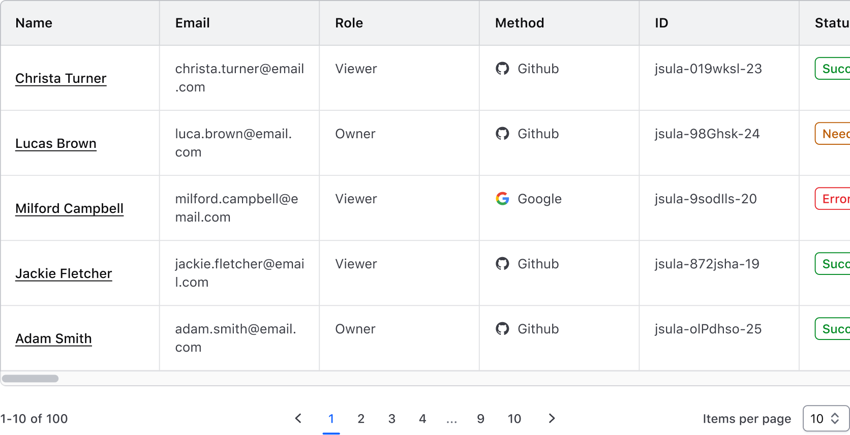 Multi-select allows users to select multiple rows to perform bulk actions, such as deleting or exporting data. The Advanced Table maintains selection states across pagination and filtering, ensuring consistency when interacting with large datasets. For more details, check out the Multi-Select Table Pattern.